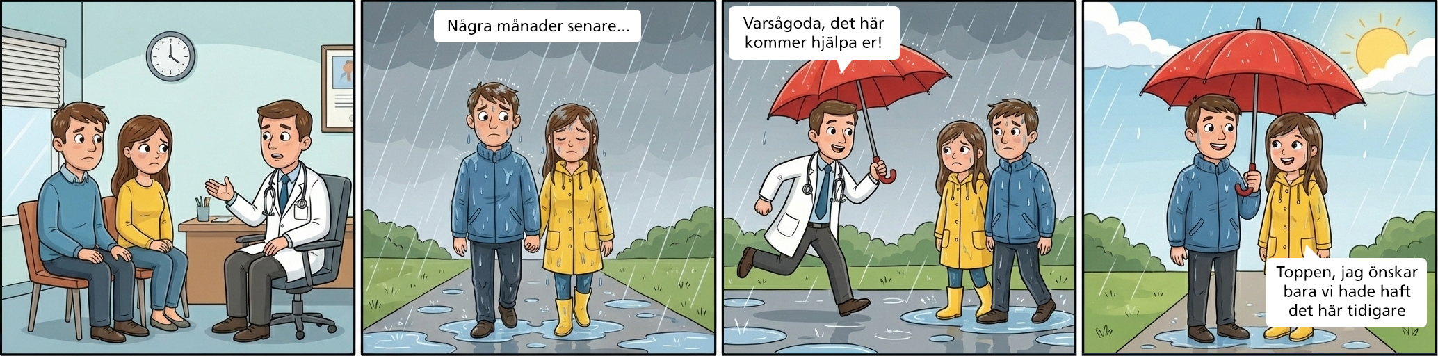 Många patienter känner oro när palliativ vård tas upp. Det kan liknas vid att känna olust för ett paraply eftersom man förknippar det med regn. Rädslan beror ofta på att palliativ vård kopplas till svår sjukdom, avslutad behandling, fokus på symtomlindring och livets slut. För att inte oroa patienten väntar vårdpersonal ibland med att ta upp palliativ vård. Detta kan dock förstärka rädslan och göra övergången svårare. Genom att prata om palliativ vård i tid och förklara att vården är ett stöd och inte behöver vara ett tecken på att slutet är nära kan missförstånd undvikas. Regnet symboliserar fysiska, psykiska, sociala och existentiella problem som kan uppstå vid svår sjukdom. Palliativ vård är paraplyet som ger skydd när problemen uppstår. Om paraplyet förväxlas med regnet kan det skapa onödig oro och hindra patienter från att få tillgång till vård som kan förbättra deras livskvalitet.